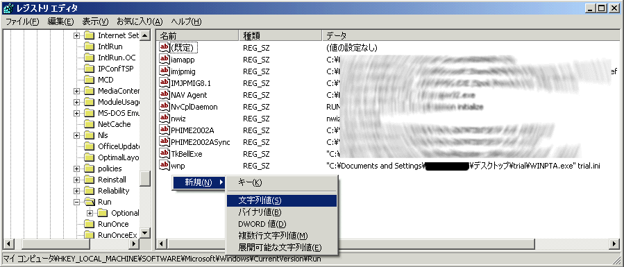 ごらんのように「マイコンピュータ\HKEY_LOCAL_MACHINE\SOFTWARE\Microsoft\Windows\CurrentVersion\Run」の項目を開きます。