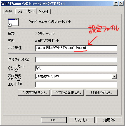 「リンク先」項目のところに「\WinPTA.exe"」という表記があるので、上の画面の赤い部分と同じように「 free.ini」と記入してください。半角で、「スペース・エフ・アール・イー・イー・ドット・アイ・エヌ・アイ」です。